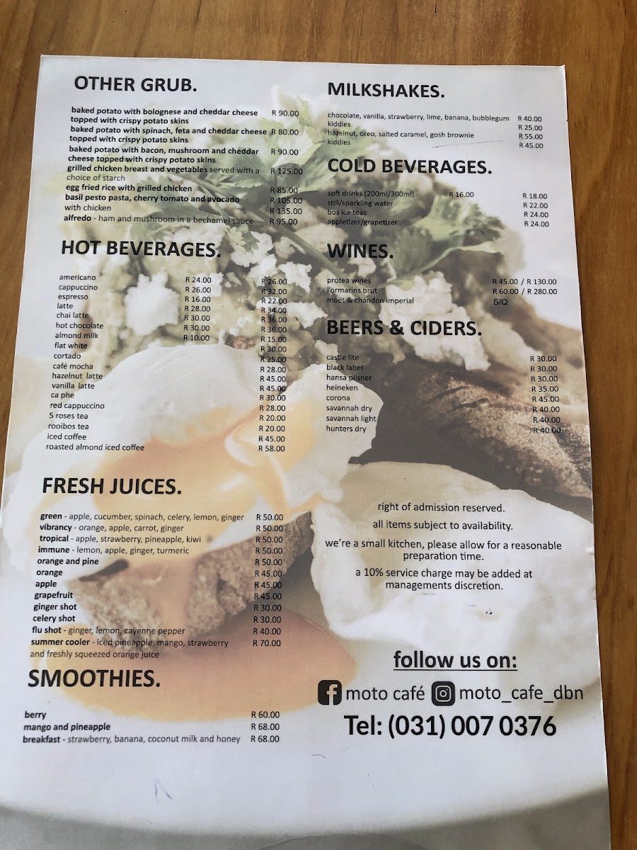 While some patrons mention the smaller meal portions, the generous and beautifully presented plates ensure every bite is memorable. With a focus on cleanliness and thoughtful service—like complimentary ice-cold water to beat the Durban heat—Moto Cafe strives to deliver an outstanding culinary experience. Whether you're on a brunch date or grabbing takeout, Moto Cafe promises a delightful culinary adventure.